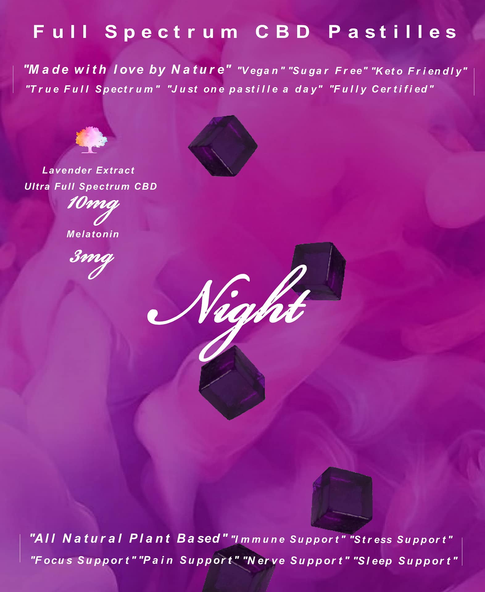 De samenstelling per pastille van de Night versie is: 3mg melatonine, 10mg CBD, 0,62mg CBG, 1,74mg CBN, 0,30mg CBC, 0,24mg CBDV